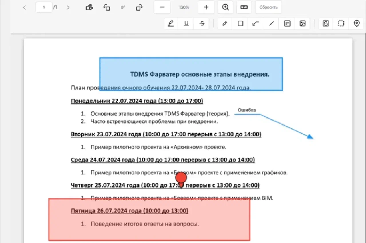 Замечания заносятся в карточку с автосохранением в режиме реального времени, при этом указываются лист документа и номер замечания. По итогам проверки замечания передаются ответственным для внесения исправлений