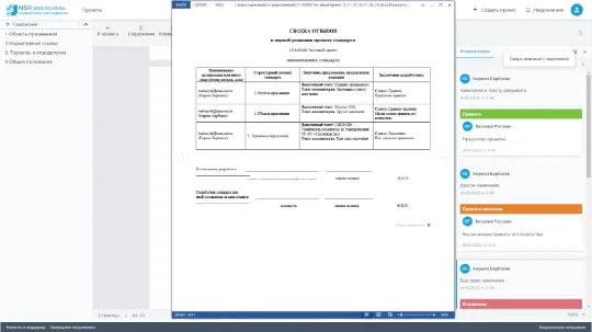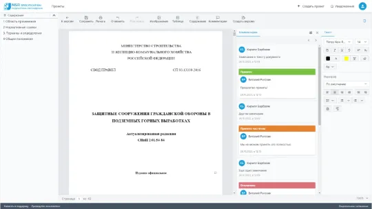 Инструмент создания версии позволяет работать в удобном интерфейсе редактора текста, где отображаются все комментарии к проекту. Это помогает при создании новой редакции стандарта, учитывающей поданные замечания.